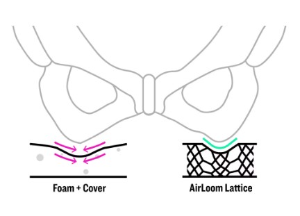 ・写真の説明=左側、従来のサドルの構造。圧力が加わると一点に集中してしまい全体に歪んでしまいます。右側、ラティスサドルにはカバーがなく、部位ごとに独立して圧縮される構造のため、身体の各部位に合わせたサポートが実現できます。